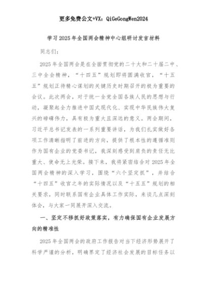 【七哥公文】2025年:学习2025年全国两会精神中心组研讨发言材料+更多免费公文+VX:QiGeGongWen2024+更多免费公文+VX:QiGeGongWen2024