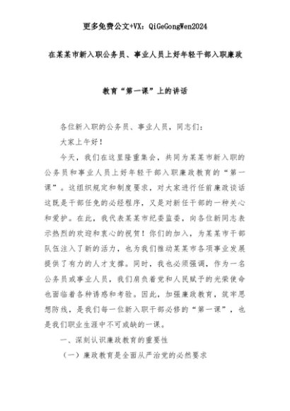 【七哥公文】2025年:在某某市新入职公务员、事业人员上好年轻干部入职廉政教育“第一课”上的讲话+更多免费公文+VX:QiGeGongWen2024+更多免费公文+VX:QiGeGongWen2024