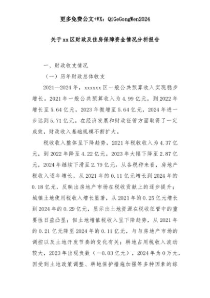 【七哥公文】2025年:关于xx区财政及住房保障资金情况分析报告+更多免费公文+VX:QiGeGongWen2024+更多免费公文+VX:QiGeGongWen2024