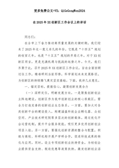 【七哥公文】2025年:在2025年XX创新区工作会议上的讲话+更多免费公文+VX:QiGeGongWen2024+更多免费公文+VX:QiGeGongWen2024