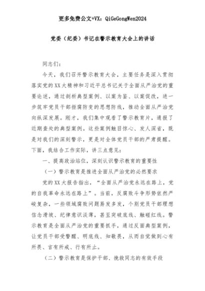 【七哥公文】2025年:党委(纪委)书记在警示教育大会上的讲话+更多免费公文+VX:QiGeGongWen2024+更多免费公文+VX:QiGeGongWen2024