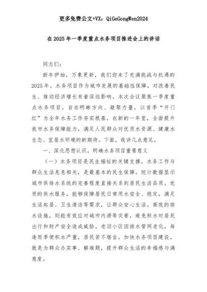 【七哥公文】2025年:在2025年一季度重点水务项目推进会上的讲话+更多免费公文+VX:QiGeGongWen2024+更多免费公文+VX:QiGeGongWen2024