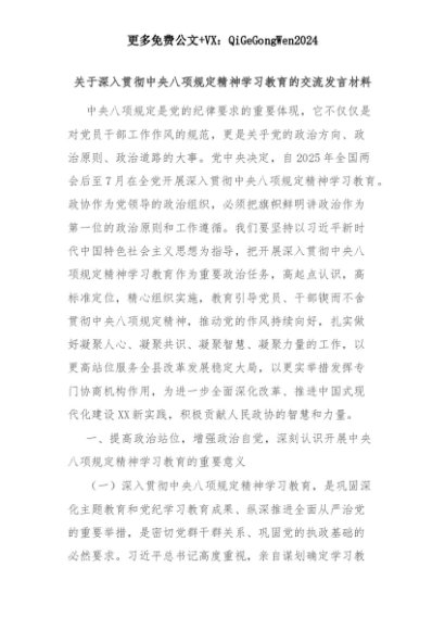 【七哥公文】2025年:关于深入贯彻中央八项规定精神学习教育的交流发言材料+更多免费公文+VX:QiGeGongWen2024+更多免费公文+VX:QiGeGongWen2024