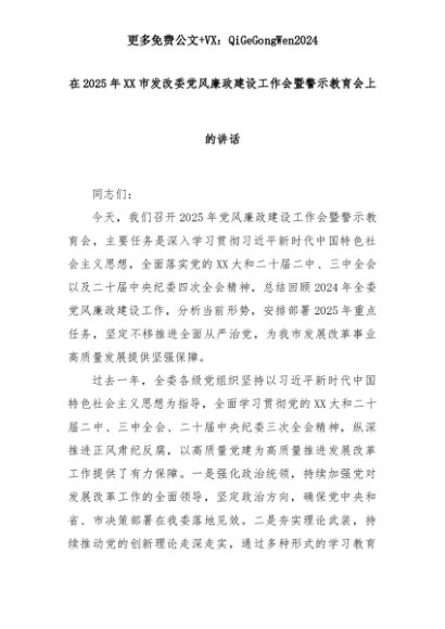 【七哥公文】2025年:在2025年XX市发改委党风廉政建设工作会暨警示教育会上的讲话+更多免费公文+VX:QiGeGongWen2024+更多免费公文+VX:QiGeGongWen2024