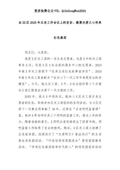 【七哥公文】2025年:在XX区2025年五老工作会议上的发言:凝聚关爱之心传承红色基因+更多免费公文+VX:QiGeGongWen2024+更多免费公文+VX:QiGeGongWen2024