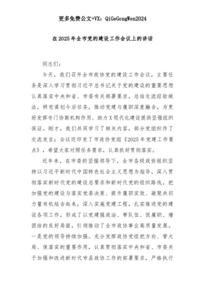 【七哥公文】2025年:在2025年全市党的建设工作会议上的讲话+更多免费公文+VX:QiGeGongWen2024+更多免费公文+VX:QiGeGongWen2024