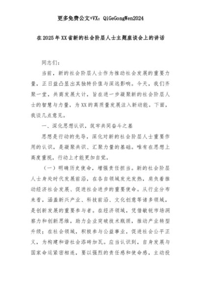 【七哥公文】2025年:在2025年XX省新的社会阶层人士主题座谈会上的讲话+更多免费公文+VX:QiGeGongWen2024+更多免费公文+VX:QiGeGongWen2024