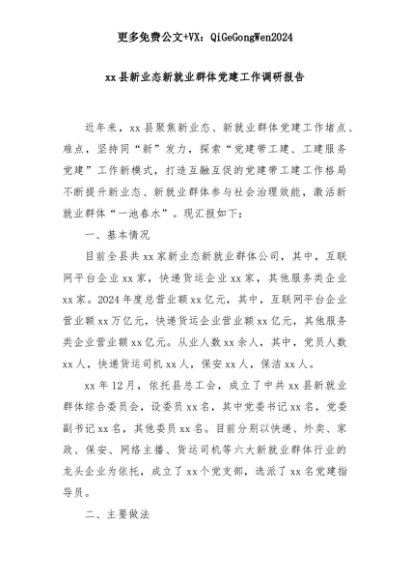 【七哥公文】2025年:xx县新业态新就业群体党建工作调研报告+更多免费公文+VX:QiGeGongWen2024+更多免费公文+VX:QiGeGongWen2024
