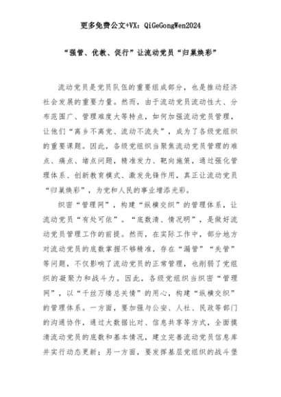 【七哥公文】2025年:“强管、优教、促行”让流动党员“归巢焕彩”+更多免费公文+VX:QiGeGongWen2024+更多免费公文+VX:QiGeGongWen2024