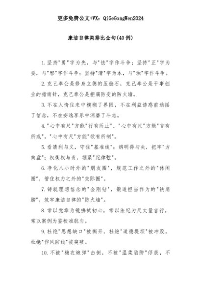 【七哥公文】2025年:(40例)廉洁自律类排比金句+更多免费公文+VX:QiGeGongWen2024+更多免费公文+VX:QiGeGongWen2024