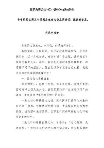 【七哥公文】2025年:中学校长在高三年级励志教育大会上的讲话:激扬青春志,共筑幸福梦+更多免费公文+VX:QiGeGongWen2024+更多免费公文+VX:QiGeGongWen2024
