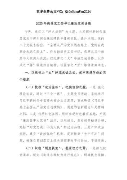 【七哥公文】2025年:2025年街道党工委书记廉政党课讲稿+更多免费公文+VX:QiGeGongWen2024+更多免费公文+VX:QiGeGongWen2024