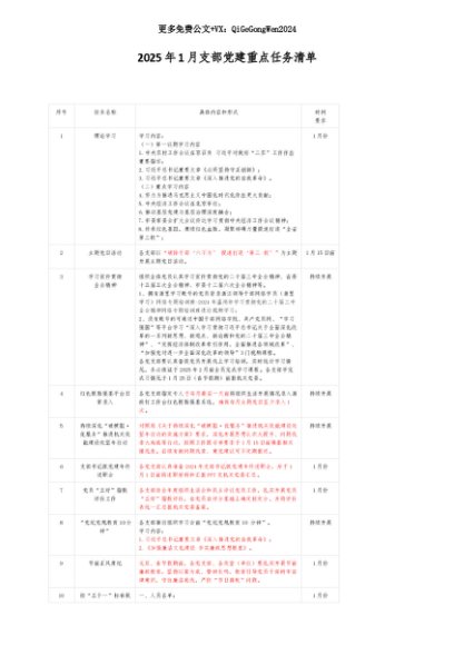 【七哥公文】2025年:2025年1月支部党建重点任务清单+更多免费公文+VX:QiGeGongWen2024+更多免费公文+VX:QiGeGongWen2024