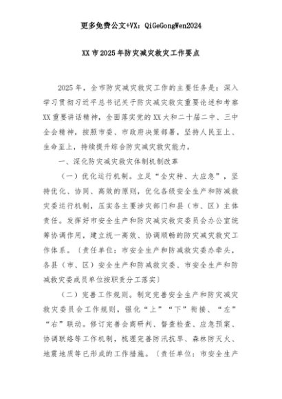 【七哥公文】2025年:XX市2025年防灾减灾救灾工作要点+更多免费公文+VX:QiGeGongWen2024+更多免费公文+VX:QiGeGongWen2024