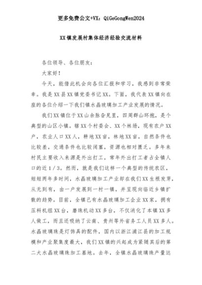 【七哥公文】2025年:XX镇发展村集体经济经验交流材料+更多免费公文+VX:QiGeGongWen2024+更多免费公文+VX:QiGeGongWen2024
