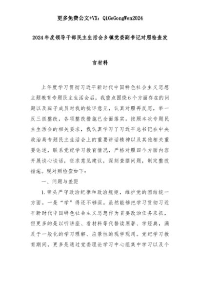 【七哥公文】2025年:2024年度领导干部民主生活会乡镇党委副书记对照检查发言材料+更多免费公文+VX:QiGeGongWen2024+更多免费公文+VX:QiGeGongWen2024