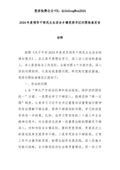 【七哥公文】2025年:2024年度领导干部民主生活会乡镇党委书记对照检查发言材料+更多免费公文+VX:QiGeGongWen2024+更多免费公文+VX:QiGeGongWen2024