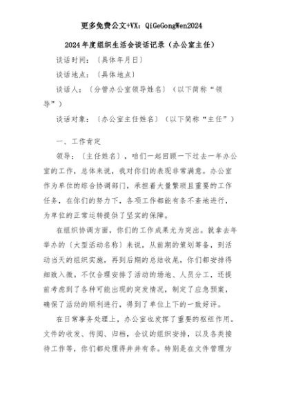 【七哥公文】2025年:2024年度组织生活会谈话记录(办公室主任)+更多免费公文+VX:QiGeGongWen2024+更多免费公文+VX:QiGeGongWen2024