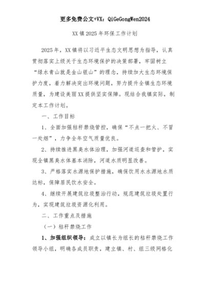 【七哥公文】2025年:镇2025年环保工作计划+更多免费公文+VX:QiGeGongWen2024+更多免费公文+VX:QiGeGongWen2024