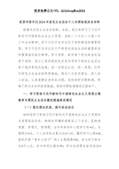 【七哥公文】2025年:某团市委书记2024年度民主生活会个人对照检视发言材料+更多免费公文+VX:QiGeGongWen2024+更多免费公文+VX:QiGeGongWen2024
