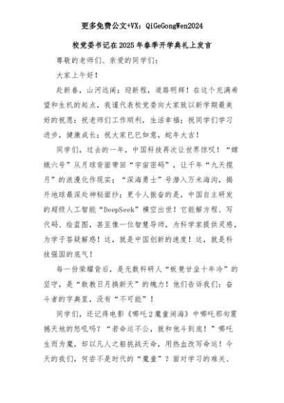 【七哥公文】2025年:校党委书记在2025年春季开学典礼上发言+更多免费公文+VX:QiGeGongWen2024+更多免费公文+VX:QiGeGongWen2024