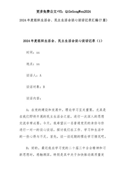 【七哥公文】2025年:(7篇)2024年度组织生活会、民主生活会谈心谈话记录汇编+更多免费公文+VX:QiGeGongWen2024+更多免费公文+VX:QiGeGongWen2024