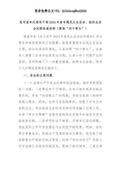 【七哥公文】2025年:某市直单位领导干部2024年度专题民主生活会、组织生活会对照检查材料(聚焦“四个带头”)+更多免费公文+VX:QiGeGongWen2024+更多免费公文+VX:QiGeGongWen2024