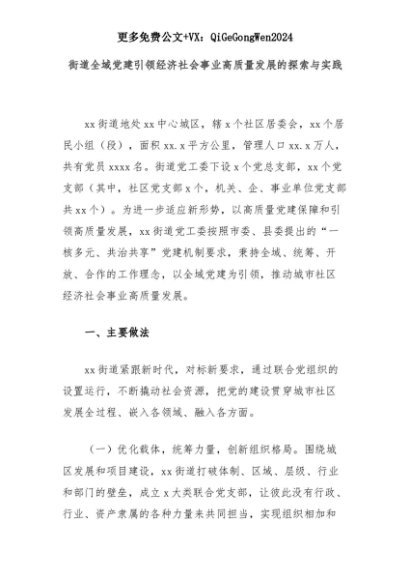 【七哥公文】2025年:街道全域党建引领经济社会事业高质量发展的探索与实践+更多免费公文+VX:QiGeGongWen2024+更多免费公文+VX:QiGeGongWen2024
