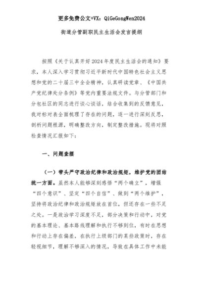 【七哥公文】2025年:街道分管副职民主生活会发言提纲+更多免费公文+VX:QiGeGongWen2024+更多免费公文+VX:QiGeGongWen2024