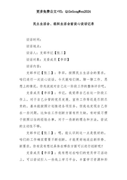 【七哥公文】2025年:民主生活会、组织生活会前谈心谈话记录+更多免费公文+VX:QiGeGongWen2024+更多免费公文+VX:QiGeGongWen2024