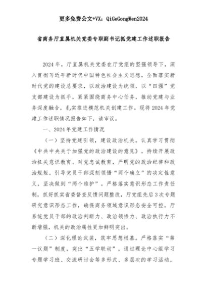 【七哥公文】2025年:省商务厅直属机关党委专职副书记抓党建工作述职报告+更多免费公文+VX:QiGeGongWen2024+更多免费公文+VX:QiGeGongWen2024