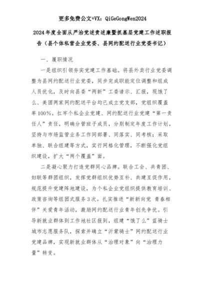 【七哥公文】2025年:2024年度全面从严治党述责述廉暨抓基层党建工作述职报告(县个体私营企业党委、县网约配送行业党委书记)+更多免费公文+VX:QiGeGongWen2024+更多免费公文+VX:QiGeGongWen2024