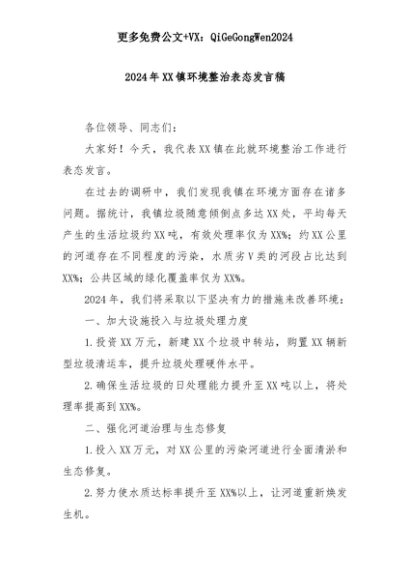 【七哥公文】2025年:2024年XX镇环境整治表态发言稿+更多免费公文+VX:QiGeGongWen2024+更多免费公文+VX:QiGeGongWen2024