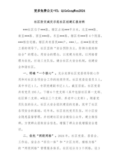 【七哥公文】2025年:社区防灾减灾示范社区创建汇报材料+更多免费公文+VX:QiGeGongWen2024+更多免费公文+VX:QiGeGongWen2024