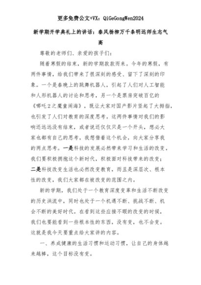 【七哥公文】2025年:新学期开学典礼上的讲话:春风杨柳万千条明远师生志气高+更多免费公文+VX:QiGeGongWen2024+更多免费公文+VX:QiGeGongWen2024