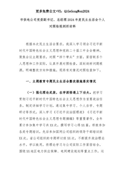 【七哥公文】2025年:市供电公司党委副书记、总经理2024年度民主生活会个人对照检视剖析材料+更多免费公文+VX:QiGeGongWen2024+更多免费公文+VX:QiGeGongWen2024