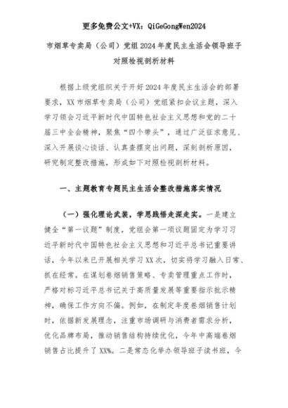 【七哥公文】2025年:市烟草专卖局(公司)党组2024年度民主生活会领导班子对照检视剖析材料+更多免费公文+VX:QiGeGongWen2024+更多免费公文+VX:QiGeGongWen2024