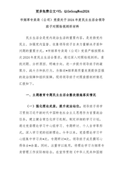 【七哥公文】2025年:市烟草专卖局(公司)党委关于2024年度民主生活会领导班子对照检视剖析材料+更多免费公文+VX:QiGeGongWen2024+更多免费公文+VX:QiGeGongWen2024