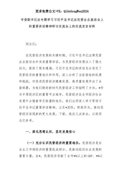 【七哥公文】2025年:市委副书记在专题学习习近平总书记在民营企业座谈会上的重要讲话精神研讨交流会上的交流发言材料+更多免费公文+VX:QiGeGongWen2024+更多免费公文+VX:QiGeGongWen2024