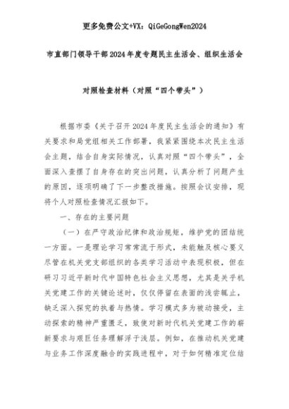 【七哥公文】2025年:市直部门领导干部2024年度专题民主生活会、组织生活会对照检查材料(对照“四个带头”)+更多免费公文+VX:QiGeGongWen2024+更多免费公文+VX:QiGeGongWen2024