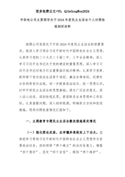 【七哥公文】2025年:市供电公司主要领导关于2024年度民主生活会个人对照检视剖析材料+更多免费公文+VX:QiGeGongWen2024+更多免费公文+VX:QiGeGongWen2024