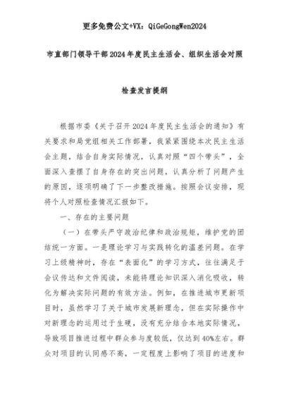 【七哥公文】2025年:市直部门领导干部2024年度民主生活会、组织生活会对照检查发言提纲+更多免费公文+VX:QiGeGongWen2024+更多免费公文+VX:QiGeGongWen2024