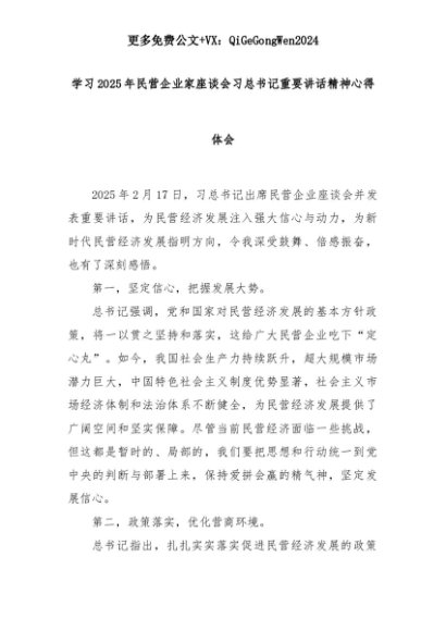 【七哥公文】2025年:学习2025年民营企业家座谈会习总书记重要讲话精神心得体会+更多免费公文+VX:QiGeGongWen2024+更多免费公文+VX:QiGeGongWen2024