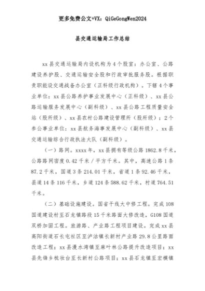 【七哥公文】2025年:县交通运输局工作总结+更多免费公文+VX:QiGeGongWen2024+更多免费公文+VX:QiGeGongWen2024