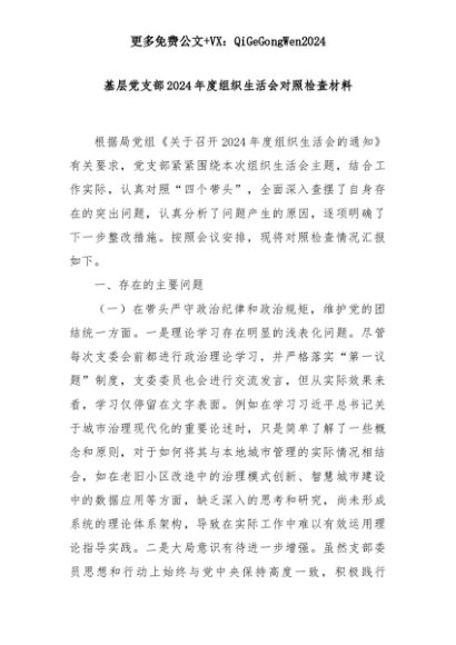【七哥公文】2025年:基层党支部2024年度组织生活会对照检查材料+更多免费公文+VX:QiGeGongWen2024+更多免费公文+VX:QiGeGongWen2024