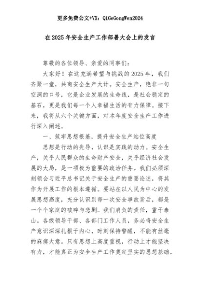 【七哥公文】2025年:在2025年安全生产工作部署大会上的发言+更多免费公文+VX:QiGeGongWen2024+更多免费公文+VX:QiGeGongWen2024