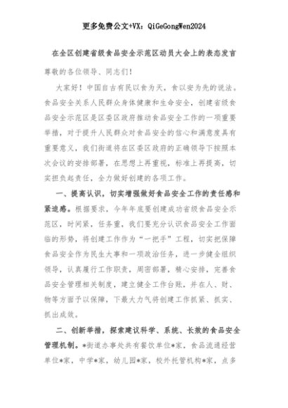 【七哥公文】2025年:在全区创建省级食品安全示范区动员大会上的表态发言+更多免费公文+VX:QiGeGongWen2024+更多免费公文+VX:QiGeGongWen2024