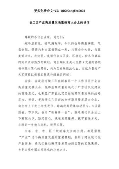 【七哥公文】2025年:在X区产业高质量发展暨招商大会上的讲话+更多免费公文+VX:QiGeGongWen2024+更多免费公文+VX:QiGeGongWen2024