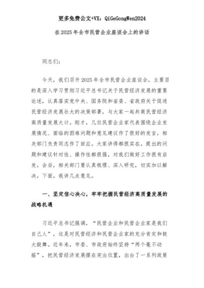 【七哥公文】2025年:在2025年全市民营企业座谈会上的讲话+更多免费公文+VX:QiGeGongWen2024+更多免费公文+VX:QiGeGongWen2024