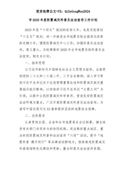 【七哥公文】2025年:市2025年度防震减灾科普及法治宣传工作计划+更多免费公文+VX:QiGeGongWen2024+更多免费公文+VX:QiGeGongWen2024
